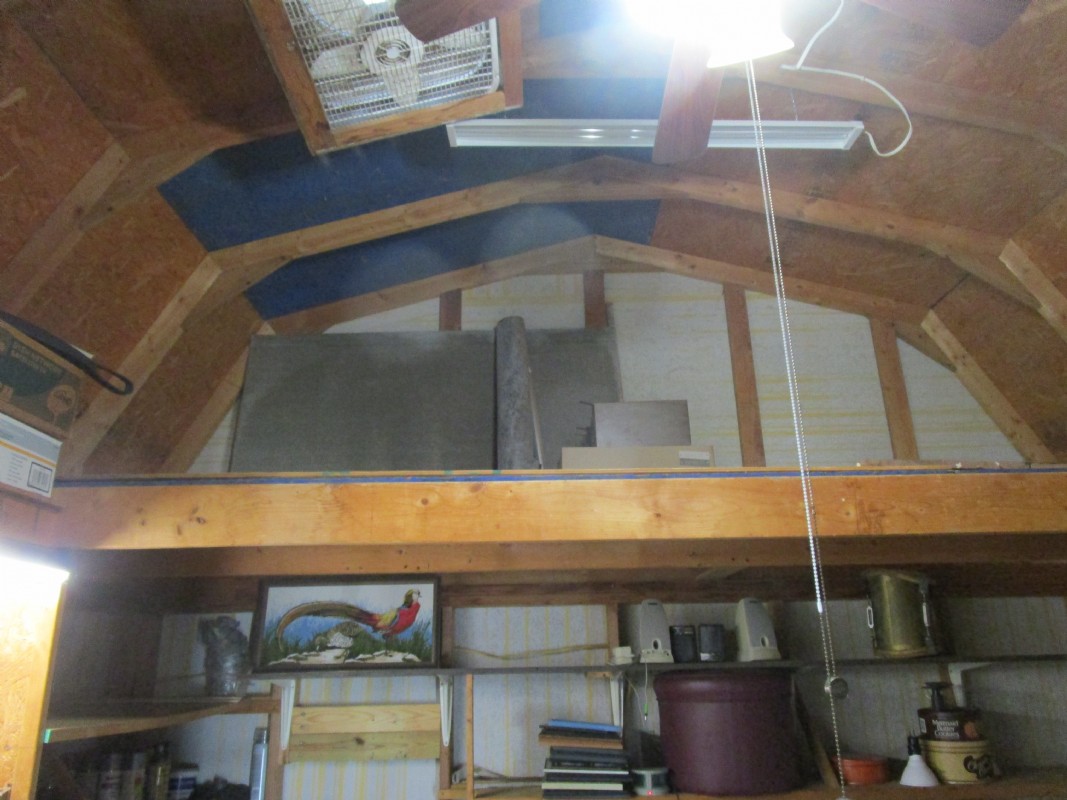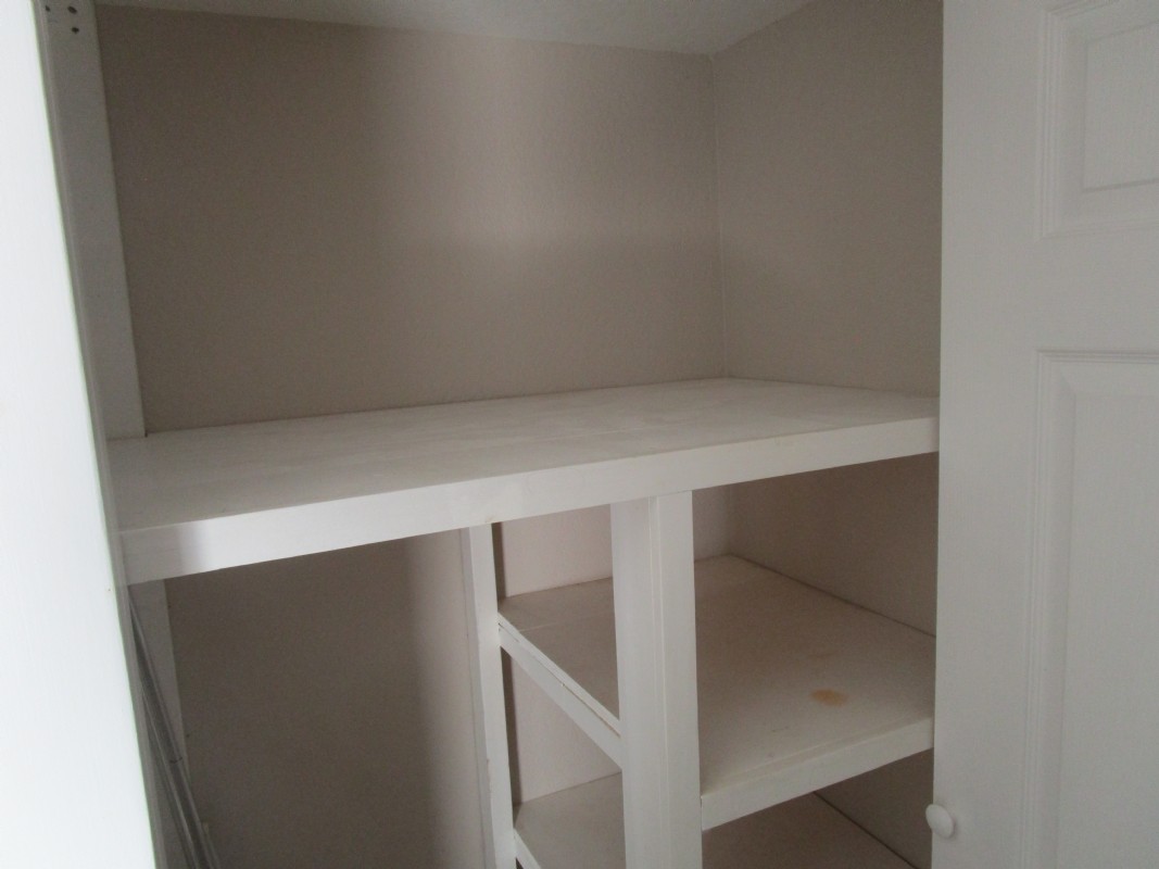 Storage room (12’ x 11’) with durable built-in wooden shelves & wall-to-wall cabinets on opposite side: base cabinets with drawers & supporting countertops. Upper cabinets with plenty of storage.